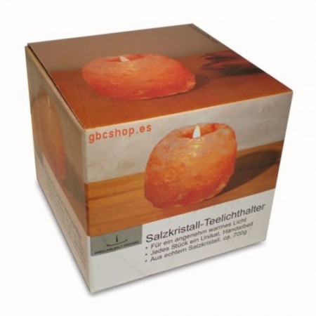 Resulta el suport ideal per a contenir espelmes de te i gaudir de l'agradable il·luminació que brinden quan la seva llum es projecta en les tonalitats cremoses i rosàcies del cristall de sal natural.